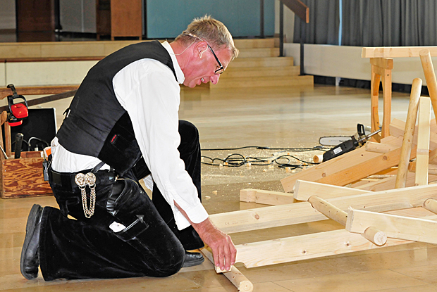 Während des Theaterstücks baut Betz die Leonardobrücke auf. Dabei unterstützen ihn meist die Schüler.