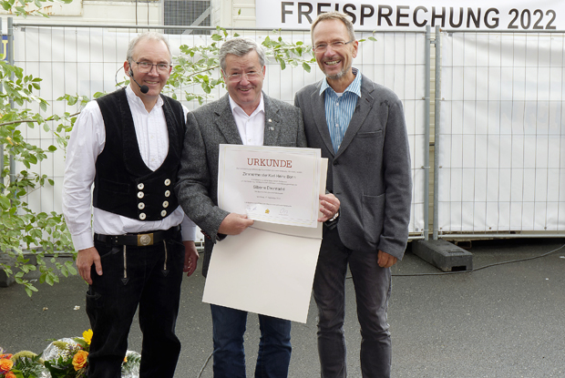 Zimmermeister und Fachoberlehrer Karl-Heinz Bonn bekam im September die Silberne Ehrennadel verliehen. Bonn wurde 1958 geboren und begann Mitte der 1970er Jahre zunächst mit einer Lehre als Karosseriebauer. Aus gesundheitlichen Gründen absolvierte er ab 1985 eine Zimmererlehre, arbeitete dann bis 1996 als Zimmerer. Da er sein Wissen weitergeben wollte, ist er seit 1996 Fachlehrer an der Josef-Greising-Schule in Würzburg, unterrichtet Theorie und Praxis. Die Semesterleitung bei der Zimmerermeisterfortbildung an der Josef-Greising Schule hat er inne und ist für die schwierigsten Fächer auf dem Weg zum Zimmerermeister zuständig.